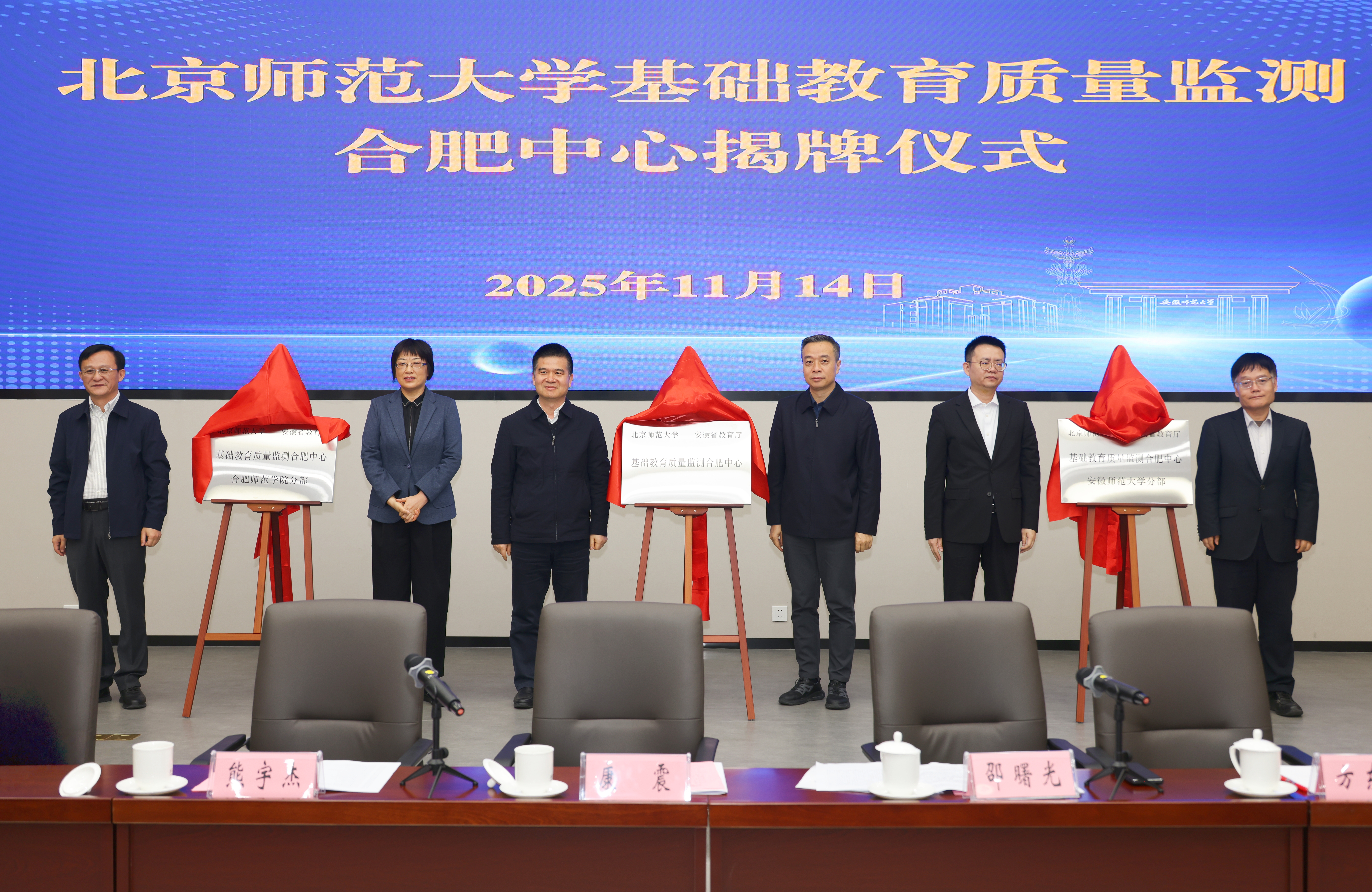 在热烈的掌声中,与会领导共同为北京师范大学基础教育质量监测合肥中心、北京师范大学基础教育质量监测合肥中心安徽师范大学分部、北京师范大学基础教育质量监测合肥中心合肥师范学院分部揭牌。